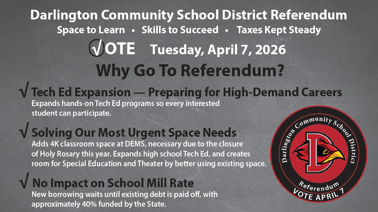 For questions please contact School Superintendent, Cale Jackson: jacksonc@darlington.k12.wi.us or 608-776-2006.